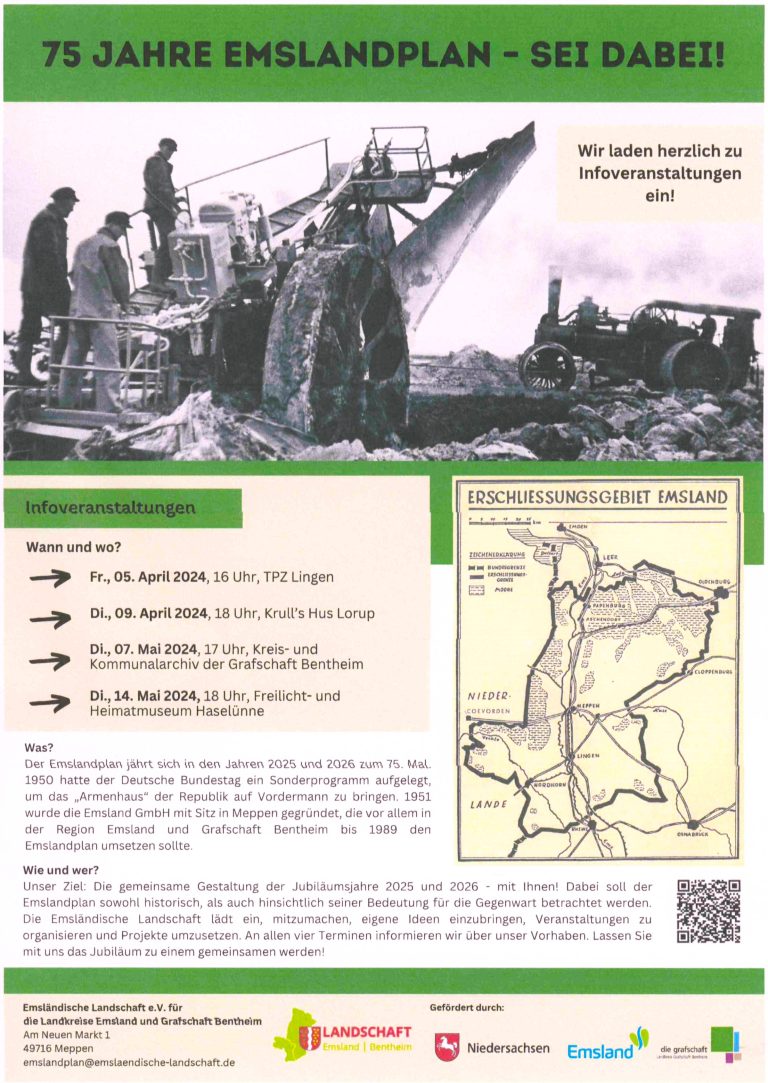 Zum 75. Geburtstag des Emslandplanes 2025 plant die Emsländische Landschaft für die Landkreise Emsland und Grafschaft Bentheim e.V., die Geschichte der Emslanderschließung in seinen unterschiedlichen Facetten zu analysieren.